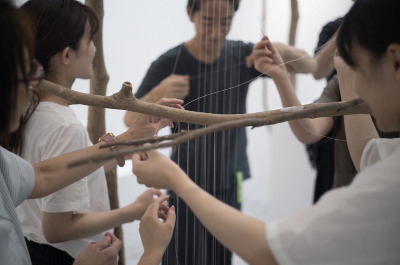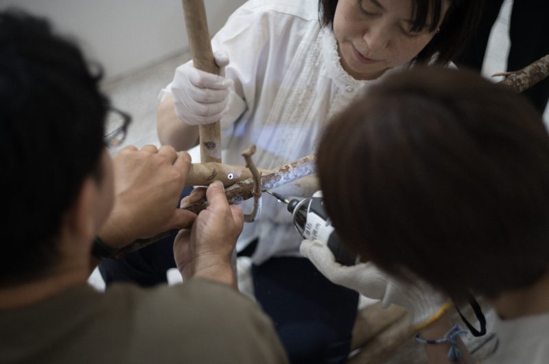 在青年部展区中,继东京与札幌之后,我们在名古屋花展也挑战了共同制作《树枝屏风》。此次亦在池坊专宗青年部代表的指导下,以「触碰树木,立于林间,生活于森林。」为主题,致力于创作象征这一理念的屏风作品。